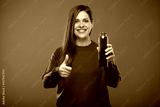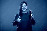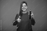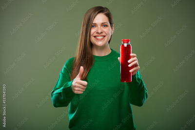 Smiling woman holding bottle with red juice and showing thumb up. Isolated advertising portrait on green.