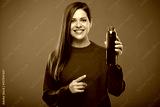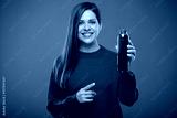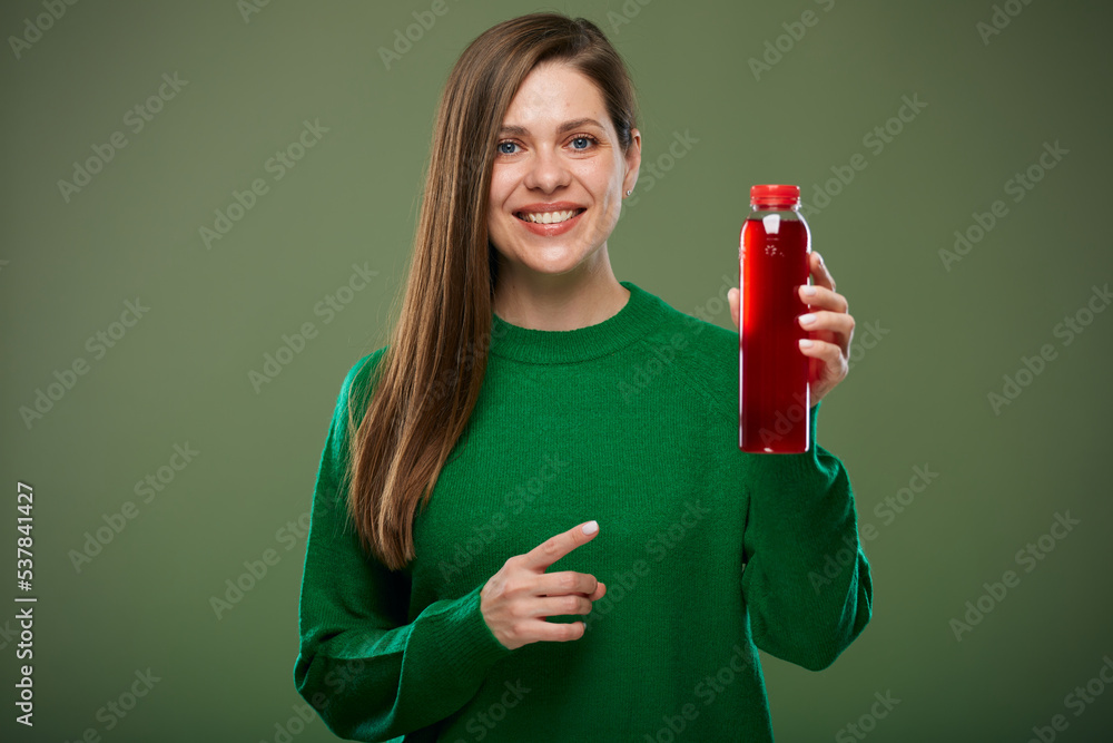 Smiling woman holding bottle with red juice and pointing finger. Isolated advertising portrait on green.