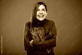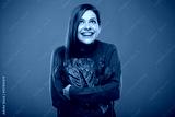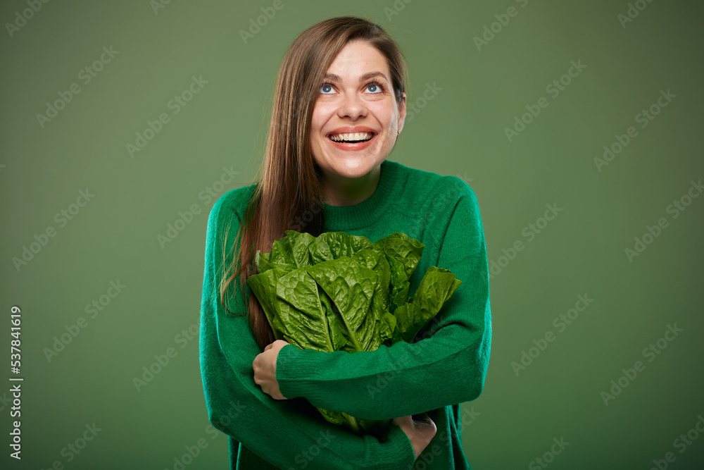 Smiling woman holding romaine lettuce salad looking up. Advertising female portrait on green.
