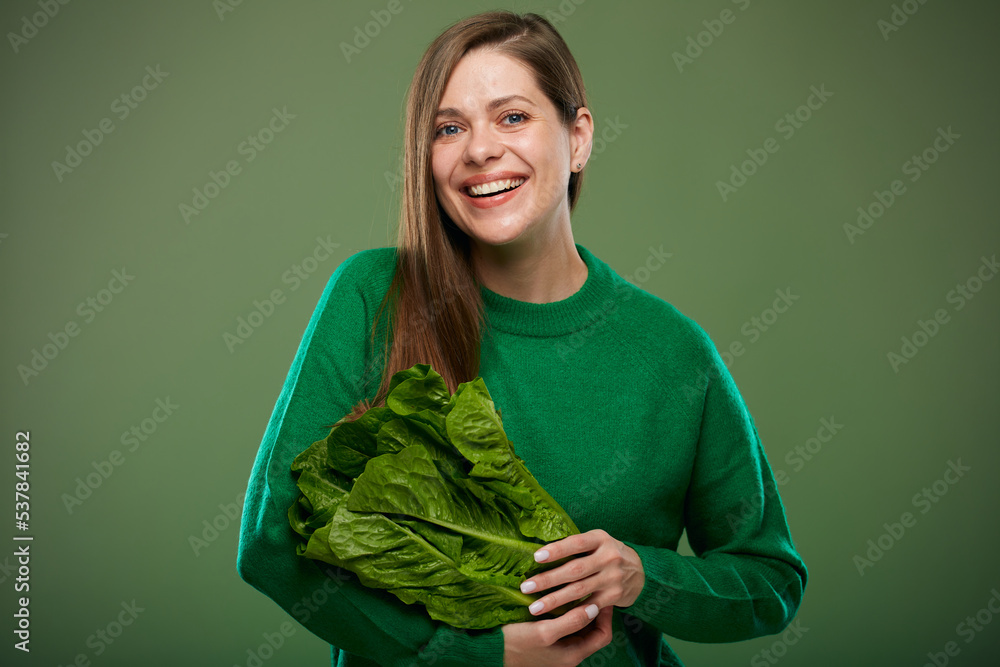 Smiling woman holding romaine lettuce salad. Advertising female portrait on green.