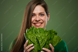 Close up face of smiling woman with romaine lettuce salad. Advertising female portrait on green.