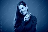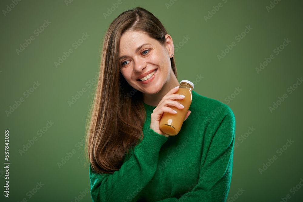 Smiling happy woman looking down advertising portrait on green with orange juice bottle.