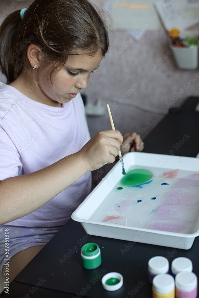 an attractive girl of primary school age of European appearance paints on the water in the ebru technique. The concept of children's creativity