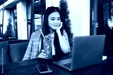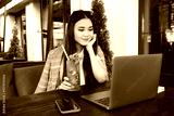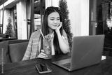 Beautiful Asian girl holding a glass of mojito and looking at something on a laptop.