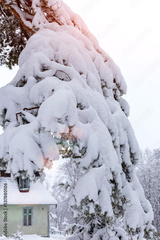 Winter. A large spruce branch is covered with a pile of snow in the sunshine