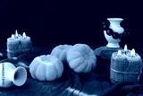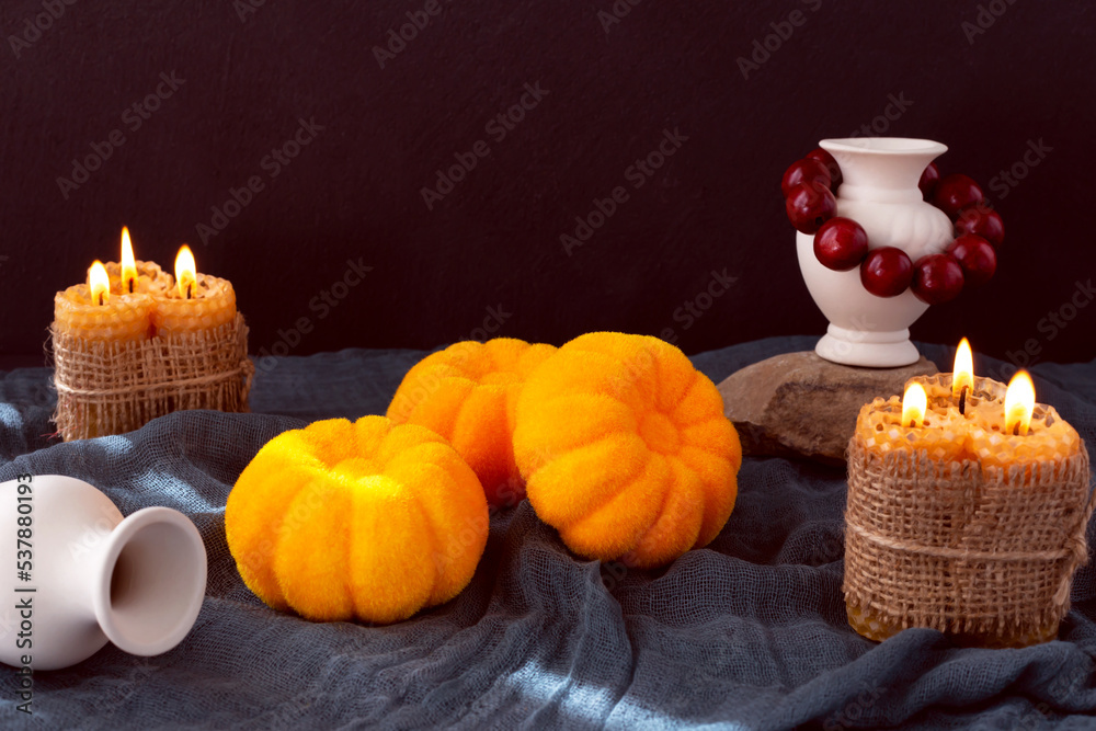 Halloween. Pumpkins, burning candles, jugs, stone and necklace. Tinting