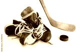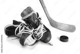 Pair of hockey skates with Hockey stick and puck isolated on white background