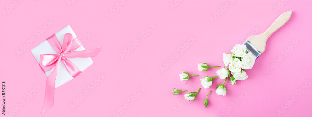 Top view of paintbrush with white rose and gift box on the pink background. Copy space. Banner.