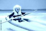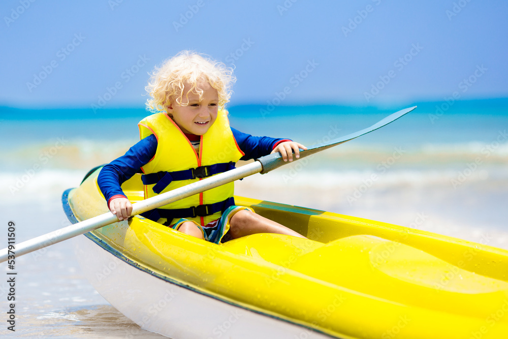 Kids kayaking in ocean. Children in kayak in tropical sea