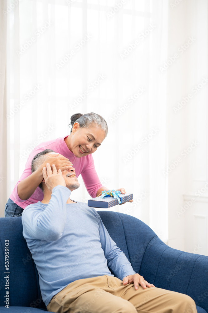 Happy Senior Asian woman covering eyes her husband for surprise with gift box in home. Elderly Asian couple on valentine's day concept. making surprise and giving a gift.