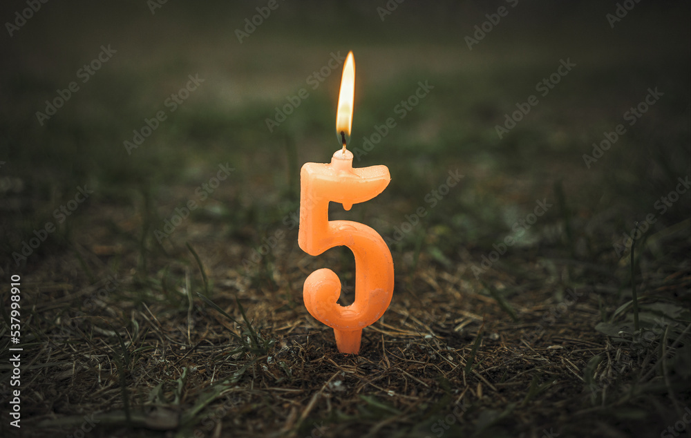A candle in the form of the number five is stuck in the ground. A burning pink candle for the anniversary of five years. Congratulatory background for congratulations on the fifth anniversary.