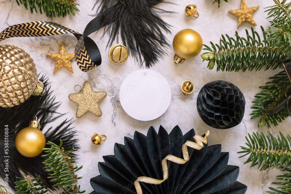 Blank round gift tag between black and golden Christmas decorations, top view, Mockup