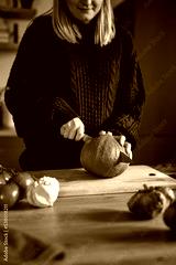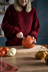 Caucasian woman cutting pumpkin for soup at the kitchen