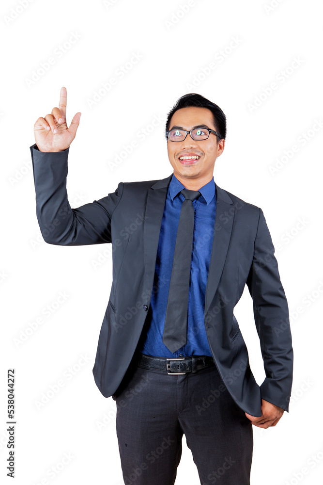 Happy businessman touching on transparent screen