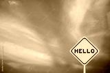 Yellow transportation sign with word hello on violet color sky background