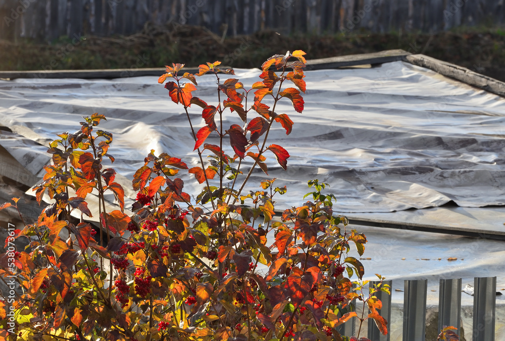 A bush of red viburnum on an autumn day
