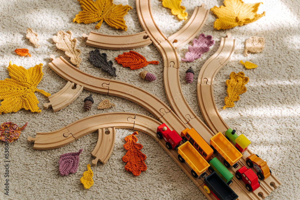Tree made from toy wooden railway with toy train and autumn leaves on the floor in children room. Fall activity for kids.