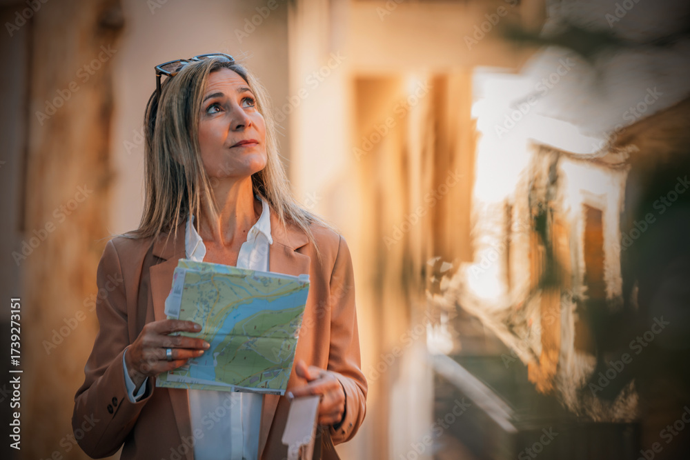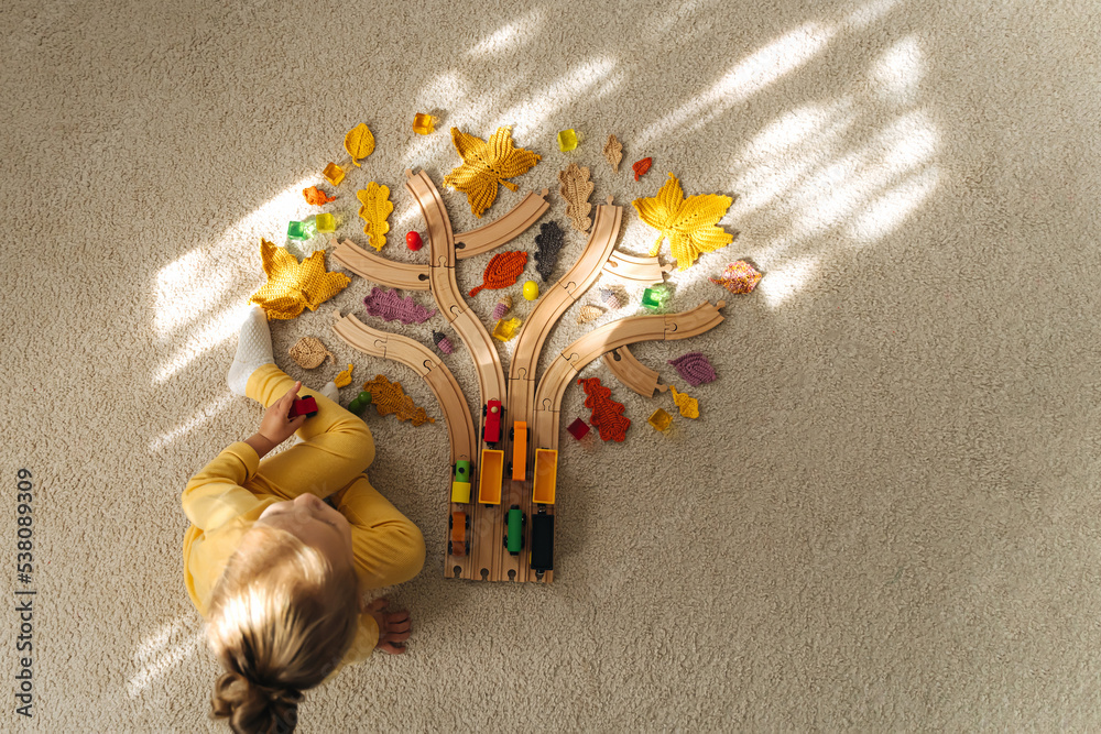 A little girl playing with autumn leaves and make a tree with wooden railway and toy train. Child sitting on floor plays with toy train locomotive and autumn decoration. Fall activity for kids.