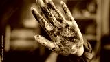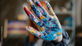 Caucasian red haired woman artist designer painter girl show dirty in paints colorful palm at camera holding hand in front of her close face with arm stop gesture not no in art studio after painting
