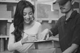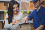 Businesswoman owner or freelance is smile and putting her signature to Courier, Delivery express service sending receiver sign, concept of shipping deliver cargo online shopping postman deliveryman.