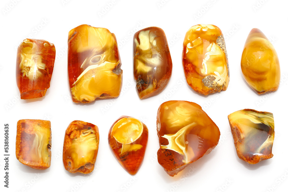 Amber with patterns on a white background. Many pieces of yellow sun stone. Jewelry material. Natural semi-precious mineral. Ancient fossil resin. Copal. Geology and science. landscape mineral
