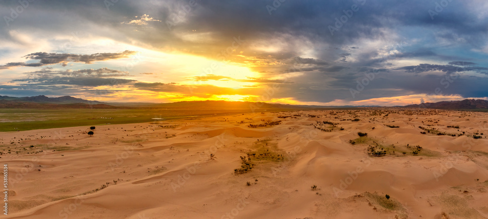 Sand dunes in desert at sunset