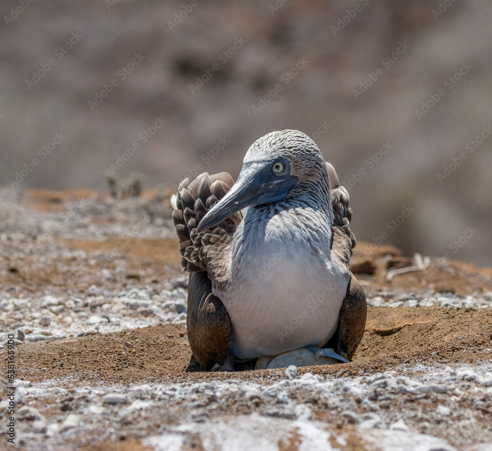 Blue footed booby nesting an egg in the Galapagos Islands, Ecuador