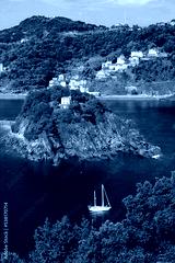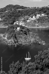 View of the city, ocean and island on the summer day. San Sebastian. Spain.