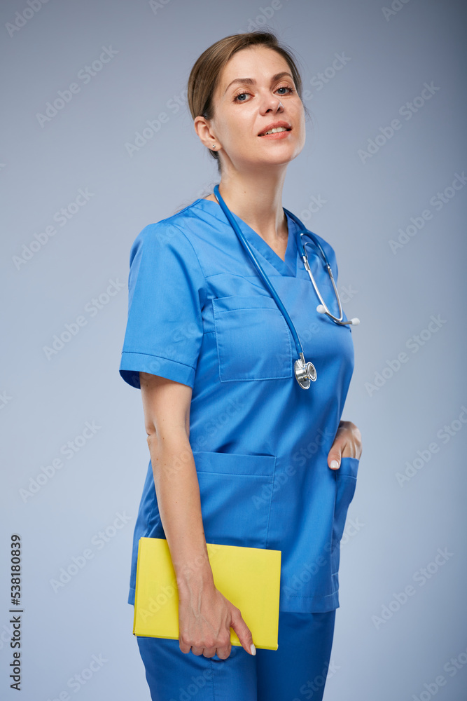 Teacher doctor or woman student standing in medical uniform with yellow book. Isolated portrait.