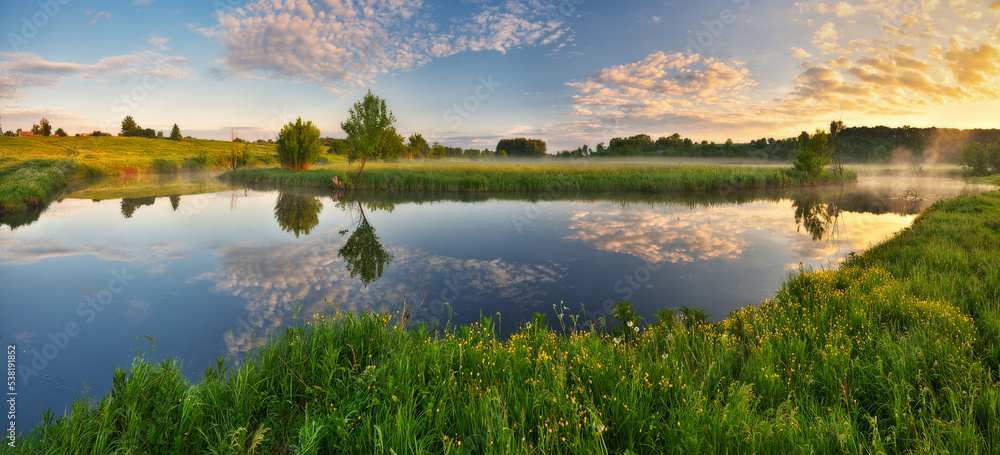 Beautiful spring sunrise over river bank. nature of Ukraine