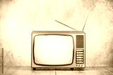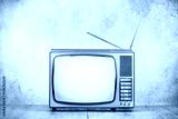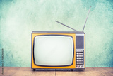 Retro old TV receiver on table front textured concrete wall background. Vintage style filtered photo