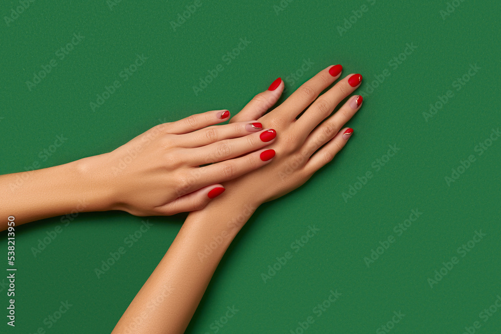Womans hands with trendy christmas red manicure on green background