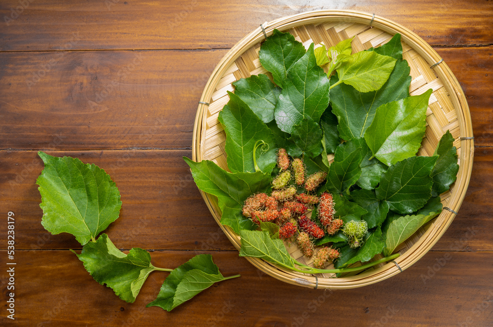 The leaves of mulberry on wooden plate, Mulberry leaves food for feeding silkworms raw materials for silk production.