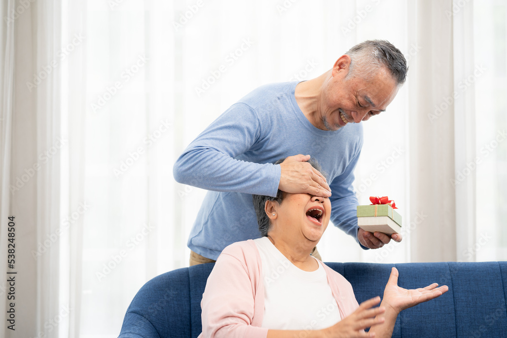 Happy Senior Asian man covering eyes of senior Asian woman for surprise with gift box in home. Elderly Asian couple on valentine's day concept.