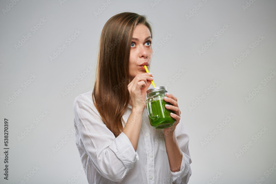 Young woman drinking green smoothie looking up. Isolated female advertising portrait.