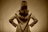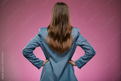 Woman in oversize jacket standing back with hands on waist. Isolated advertising portrait on pink back.