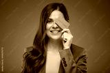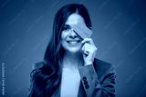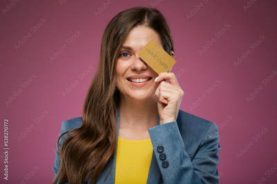 Smiling woman holding credit card against eye. Isolated advertising portrait on pink back.