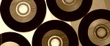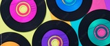 Colorful vinyl CD discs in flat lay banner format displayed on a multicolored background, retro records conceptual image.