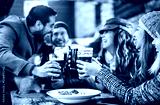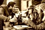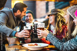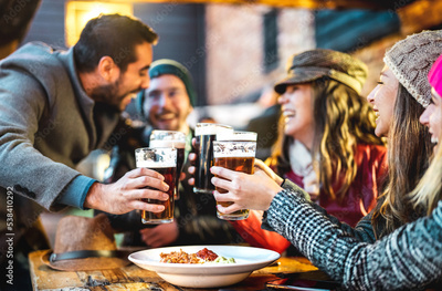 Friends having fun drinking beer at restaurant garden on winter time - People lifestyle concept at outdoors pub brewery