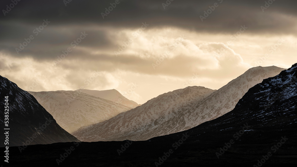 Majestic dramatic Winter sunset sunbeams over landscape of Lost Valley in Etive Mor in Scottish Highlands