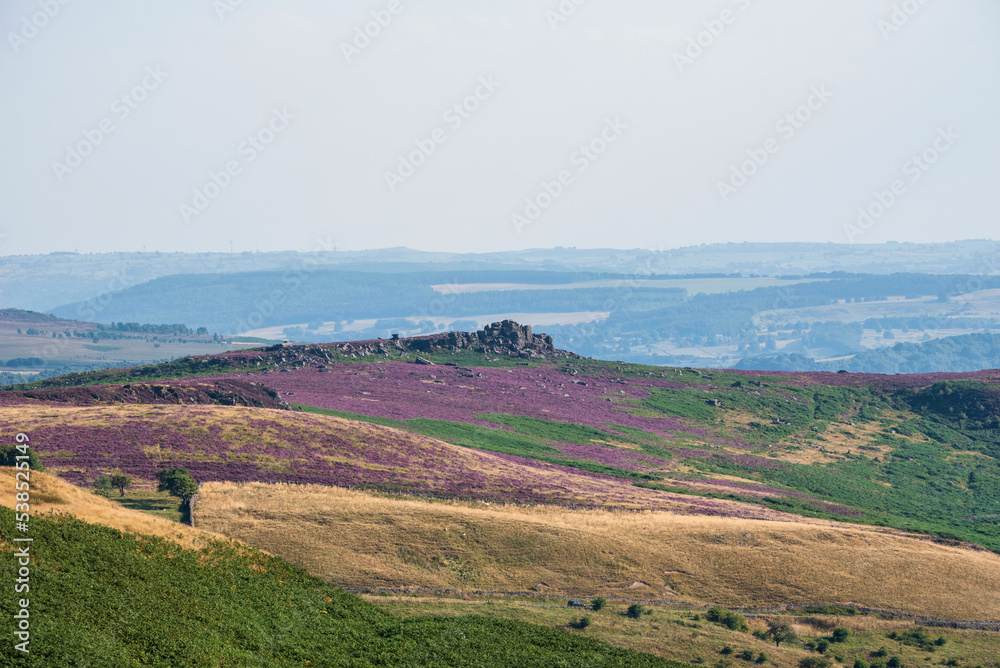 Lovely Summer day landscape image of Higger Tor vibrant heather viewed from Stanage Edge in Peak District