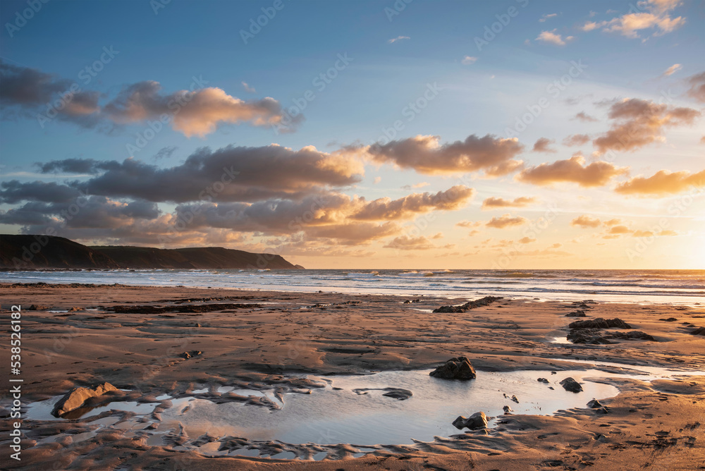 Stunning Summer sunset landscape image of Widemouth Bay in Devon England with golden hour light on beach