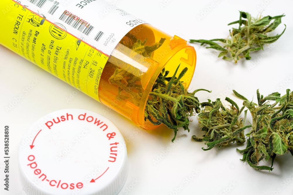 Cannabis (Medical Marijuana) Prescription - Dried Flower Spilling from Bottle