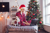 middle aged woman reading a Christmas message on her laptop computer at home