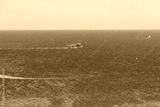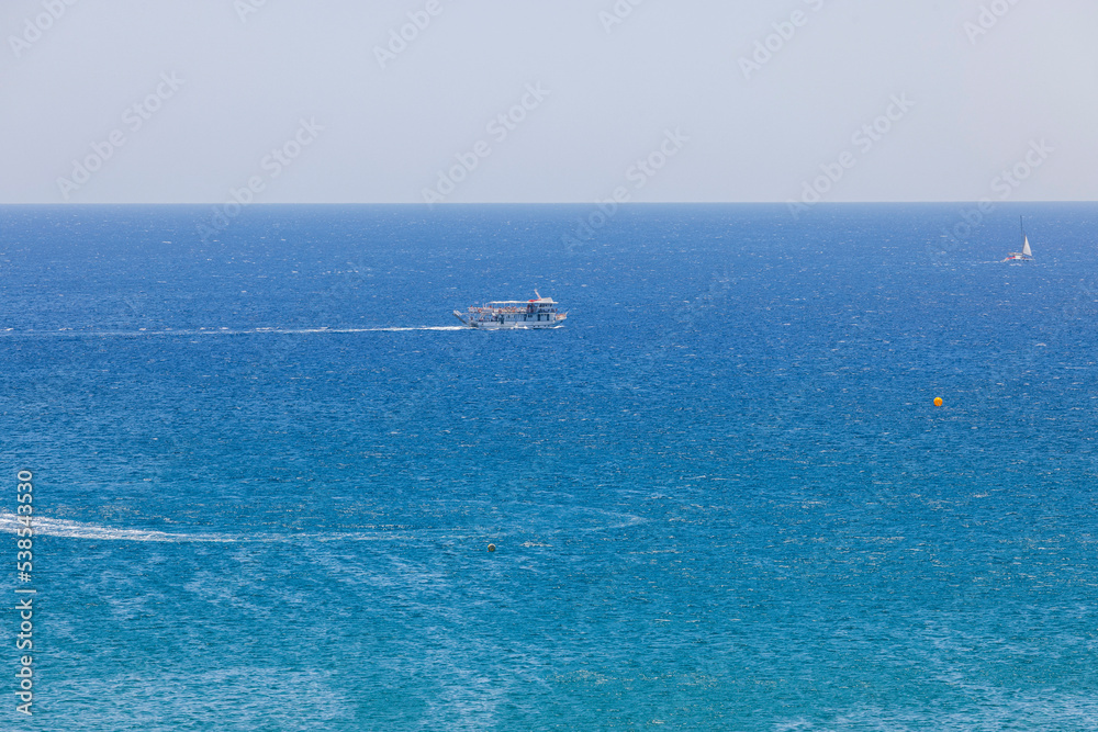 View of sailing yacht in sea. Blue sea water surface and blue sky background. Greece.