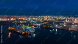 aerial view shipyard dry dock maintenance and repair container ship transport and oil ships in sea, business and industry service at night over lighting cityscape blue sky background