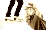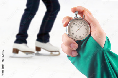 measuring speed on skates with a stopwatch. hand with a stopwatch on the background of the legs of a man skating on an ice rink