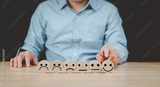 customer services best excellent business rating experience. Satisfaction survey concept. Hand of a businessman chooses a smile face on wood block circle. 5 Star Satisfaction