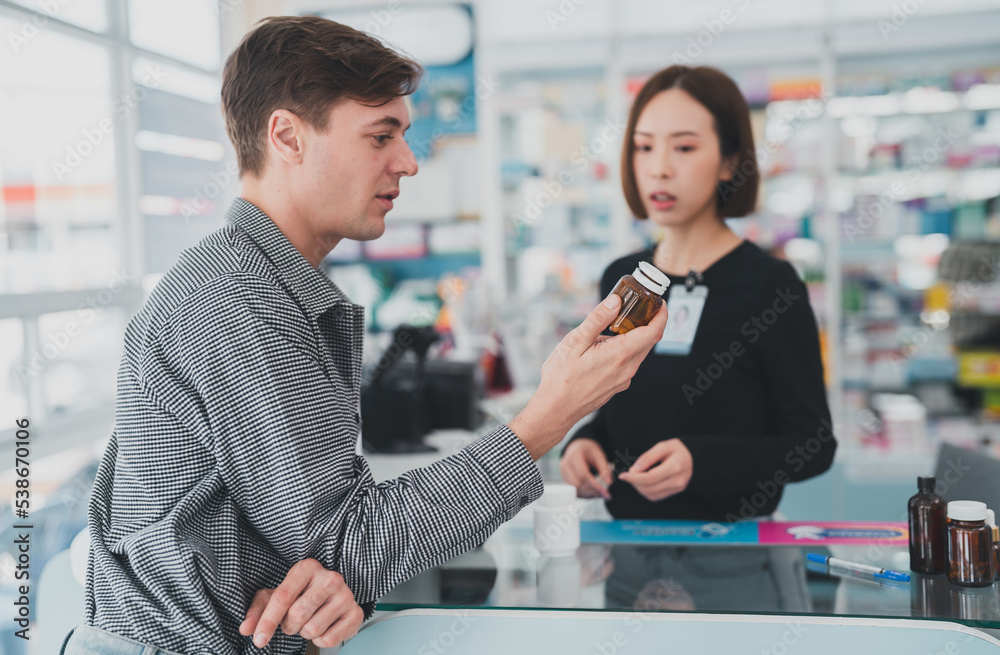 A male customer asks a pharmacist for a prescription pill.Female pharmacist with medical expertise.he doctor prescribes the pills according to the customer prescription.