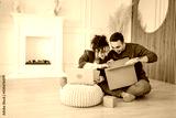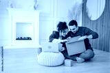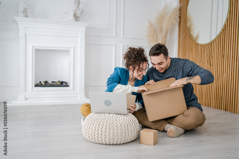 man and woman couple open gift box presents at home happy smile